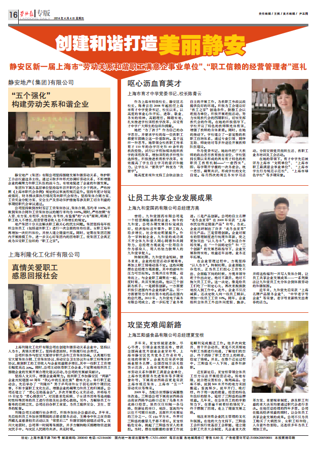 利隆被评为“上海市劳动关系和谐职工满意企事业单位”