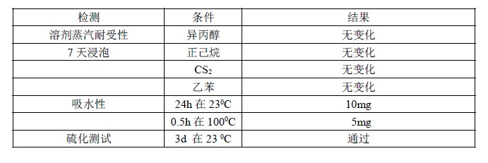 耐潮湿,弱酸,弱碱以及溶剂油等性能优异。硫化实验效果好,能适用于汽车与船舶等苛刻